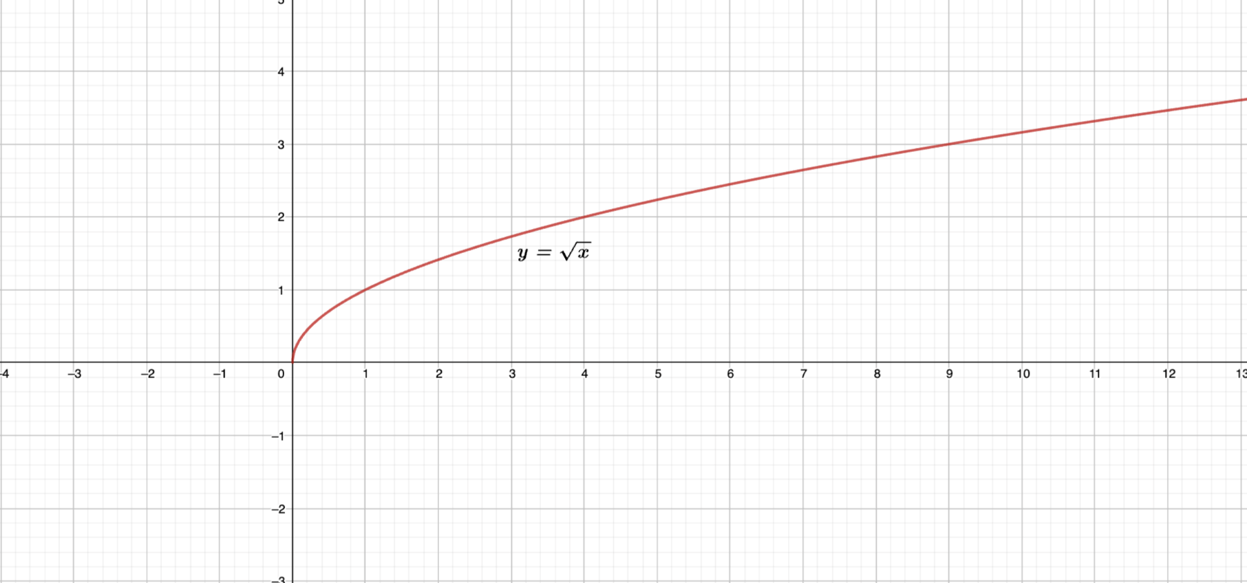 La courbe part de l'origine et monte de plus en plus lentement. Elle est en forme de « demi-parabole couchée ».
